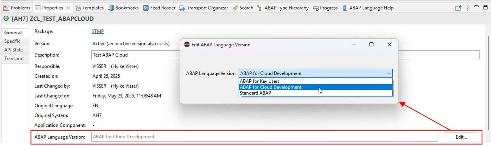 ABAP Cloud kan gebruikt worden door de language version in de eigenschappen van een ontwikkelobject aan te passen in ‘ABAP for Cloud Development’. De language version kan in een ontwikkelklasse ook als default worden ingesteld.
